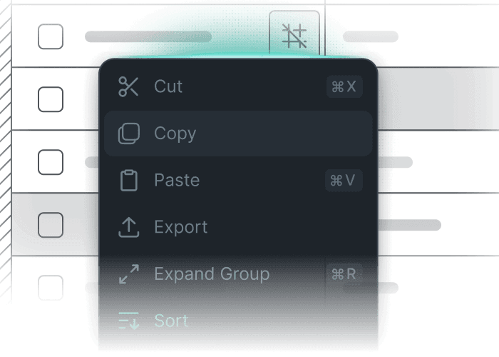 Copy, cut, and paste. Transform and update your tabular data with minimal effort. LyteNyte Grid handles parsing and validation behind the scenes, so you can apply changes with confidence.